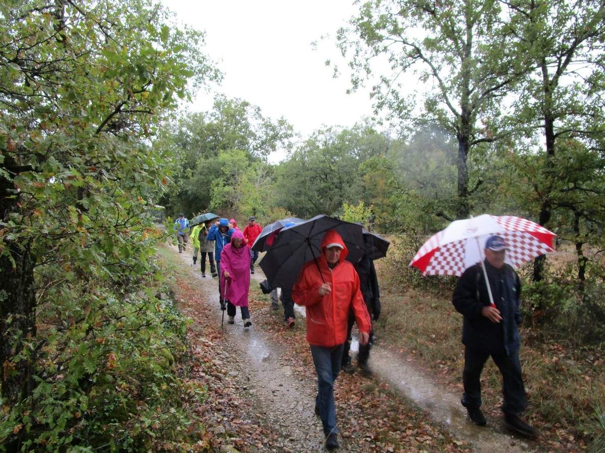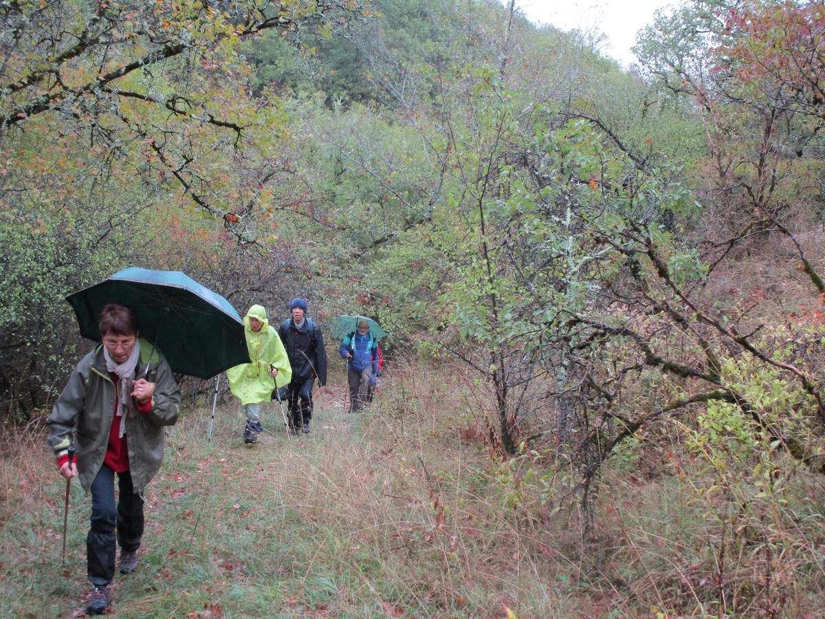 Une journée maussade, mais des participants ravis malgré tout. Malgré la pluie battante, après les conciliabules du départ, seize courageux ont bravé les éléments pour randonner sur un parcours tracé au beau milieu des frondaisons, au plus près de la rivière "Rauze" qui déroule son cours au fond d'une vallée profonde, bordée de prairies où paissent de très beaux équidés, sans doute "taillés" pour fouler un jour les champs de courses. Nous cheminerons au milieu d'une végétation luxuriante, malheureusement trop souvent ternie par la présence de buis ayant subis les outrages de la dévastatrice chenille pyrale, tout en longeant le cours de cette belle rivière, jusqu'au moulin de Maquefave. La douce remontée par un très beau sentier herbeux, bordé de cours d'eau asséchés dans lesquels les racines apparentes "moussues" donnent un petit air de "mangrove amazonienne" à ces lieux.