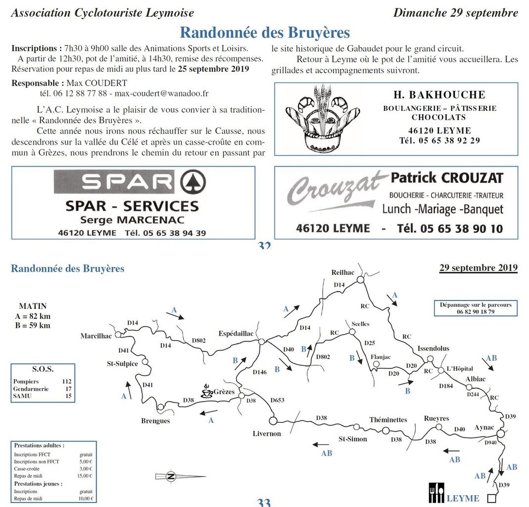 Vous êtes invités le dimanche 29 septembre 2019 à la randonnée organisée par le l'Association Cyclotouriste Leymoise de Leyme (Lot) qui organise sa traditionnelle "Randonnée des Bruyères".