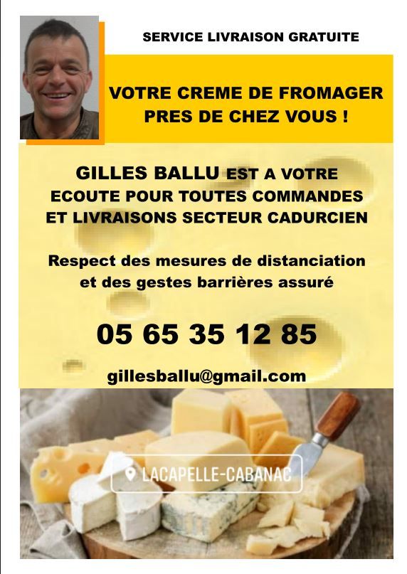 A la suite de la fermeture du marché de Cahors, nos amis commerçants sont dans la "mouise". Gilles Ballu, notre grand sportif "diplômé de Paris-Brest-Paris"et fromager sur le marché est de cela. Il propose de faire des livraisons à domicile. Alors, n'hésitez pas.